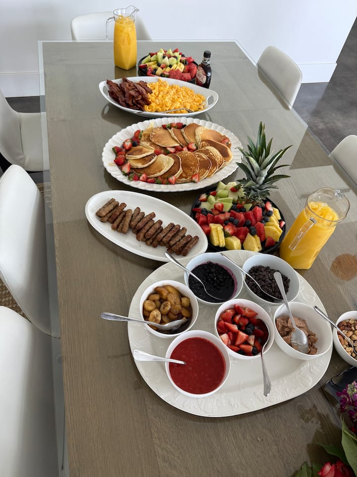 Ditt val av pannkakor, våfflor eller fransk toast med olika pålägg, tillsammans med färsk frukt, ägg, bacon, korv och ditt val av apelsinjuice eller lemonad.