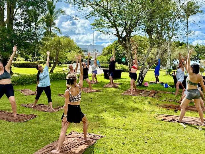 Denna kombinationsklass kan äga rum utomhus, på ett Airbnb-boende eller nästan vilken plats som helst. Upp till 6 mattor, block och remmar kan tillhandahållas.