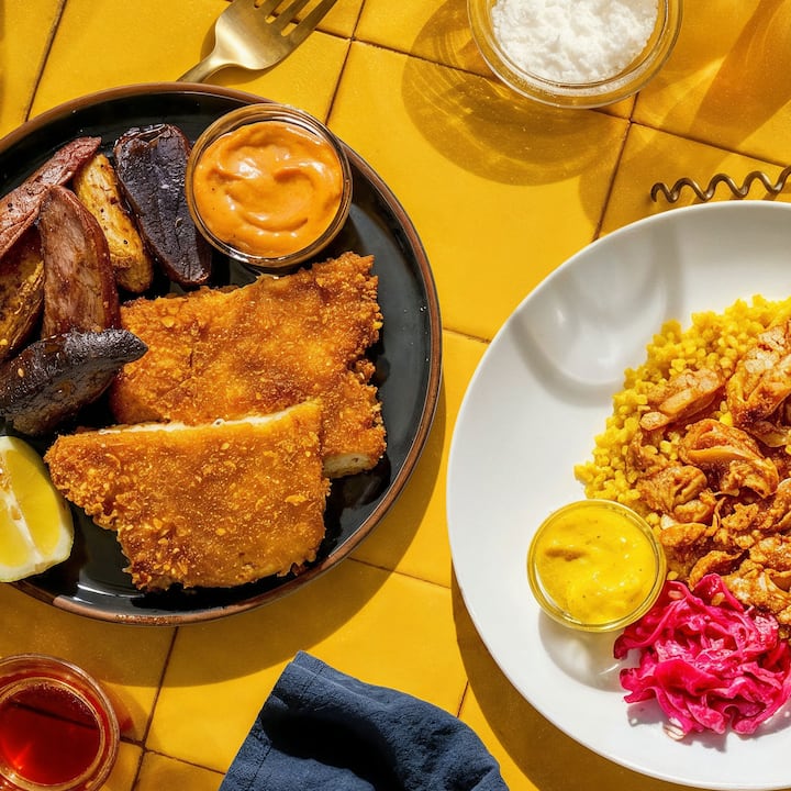 4 måltider. Kombinera två av de mest populära rätterna – Middle Eastern Shawarma Chicken (shawarma-kryddad kyckling och israelisk couscous med söt inlagd kål och syrlig Amba aioli), Chicken with Za'atar Potatoes (krispig panko kycklingkotlett, kryddad regnbågsfingerlingpotatis och en skvätt harissa aioli).