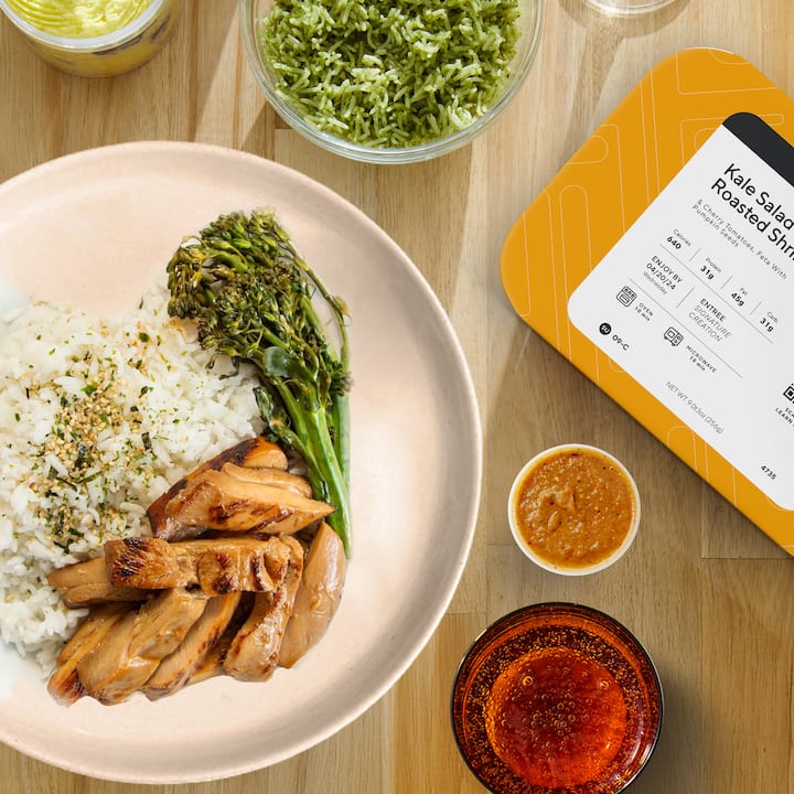 Mör kyckling glaserad i söt-salt teriyaki, tillsammans med furikake vitt ris och kolad broccolini. Träffar varje djärv, salig-söt ton med gott om umami i mixen. Inkluderar 1 kycklingteriyaki-måltid per gäst.