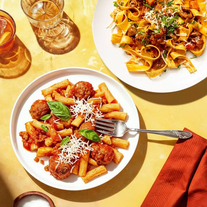 4 måltider. Mysig komfort väntar – Mors söndagsrigatoni (autentisk traditionell söndagssås precis som mormor brukade göra med mjuka salta köttbullar, syrlig autentisk marinara och kryddig italiensk fläskkorv), Pappardelle med fläskragu (rik fläskskuldra, långsamt tillagad tills den faller sönder med tomater, morötter, lök och selleri, vilket skapar en rik och robust sås. Serveras över breda och silkeslena pappardelle-nudlar).