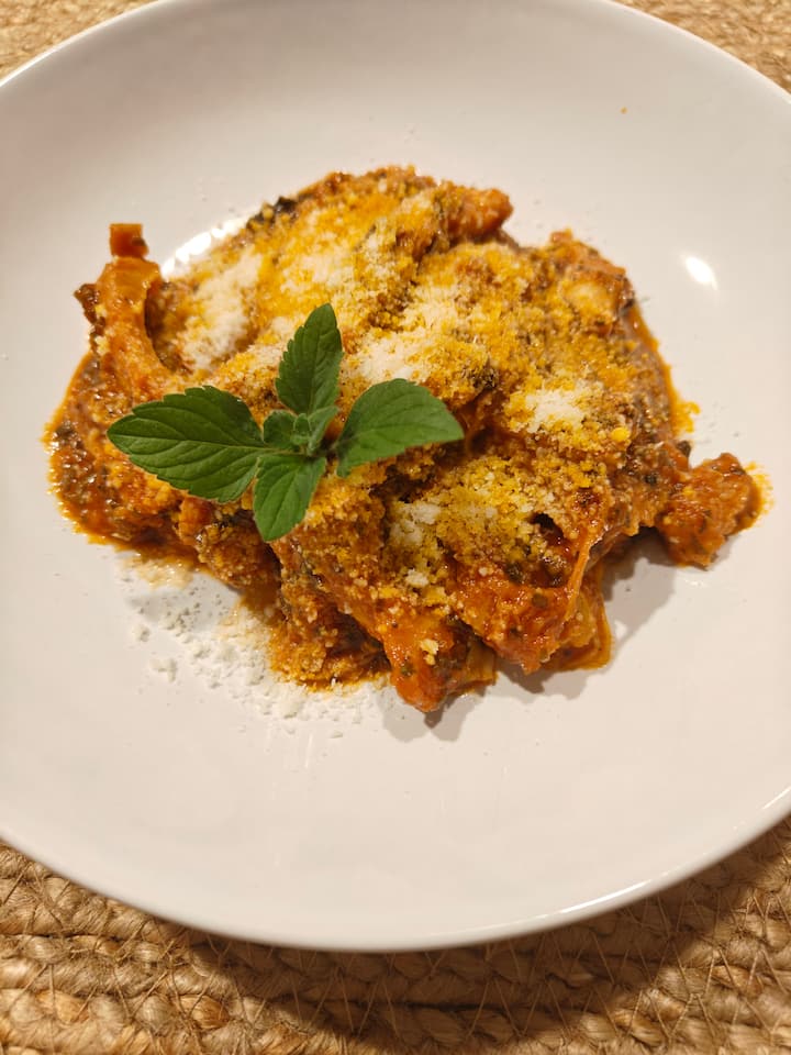 Denna omtolkning av det klassiska receptet passar både som förrätt och som en komplett måltid. Detta alternativ inkluderar en portion lasagne på 270–300 gram, toppad med stekt Romanesco-zucchini och rökt Provola-ost, med en muskotinfuserad béchamelsås. Följande allergener förekommer: ägg, mjölk, gluten.