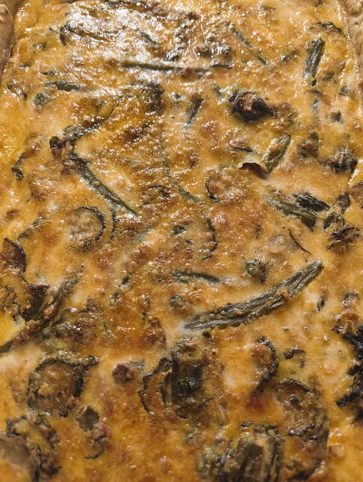 Detta alternativ är perfekt för en snabb lunchpaus som du kan njuta av på kontoret eller hemifrån. Receptet består av en hantverksmässig smördegbas av delvis fullkornsvete, fylld med lokala säsongsgrönsaker och en krämig ost. Portionen väger cirka 270–290 gram, och de allergener som förekommer är: ägg, mjölk och gluten.