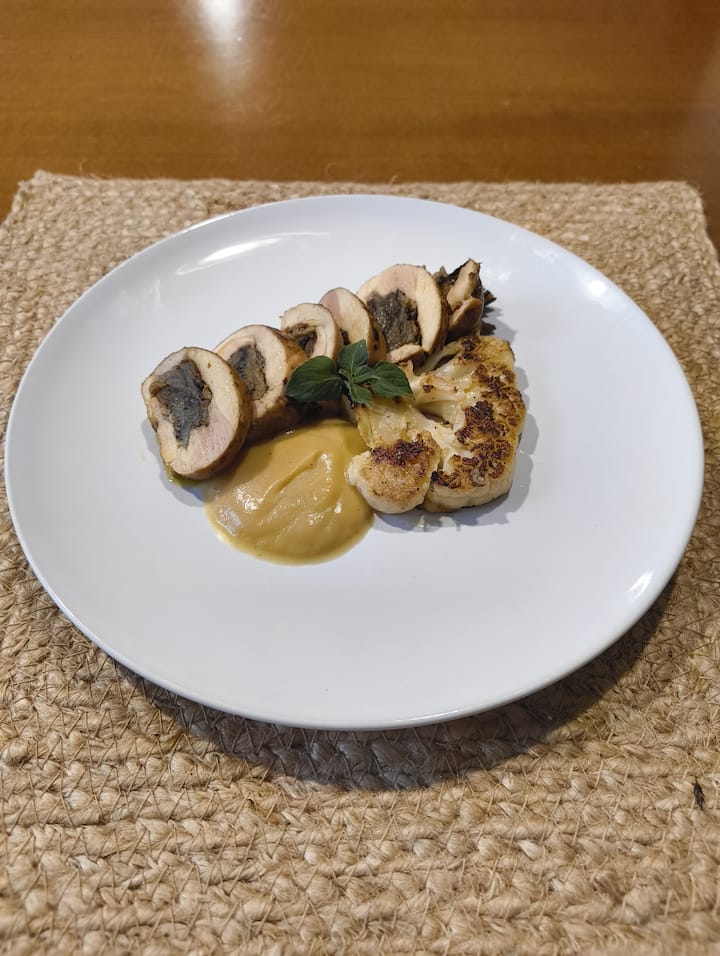 Det här alternativet passar för dem som vill njuta av en välsmakande och välbalanserad huvudrätt. Detta alternativ inkluderar en portion på 220–240 gram av långsamt tillagad kycklingrullad fylld med svamp och säsongsgrönsaker. Receptet innehåller ett enda allergen: mjölk.