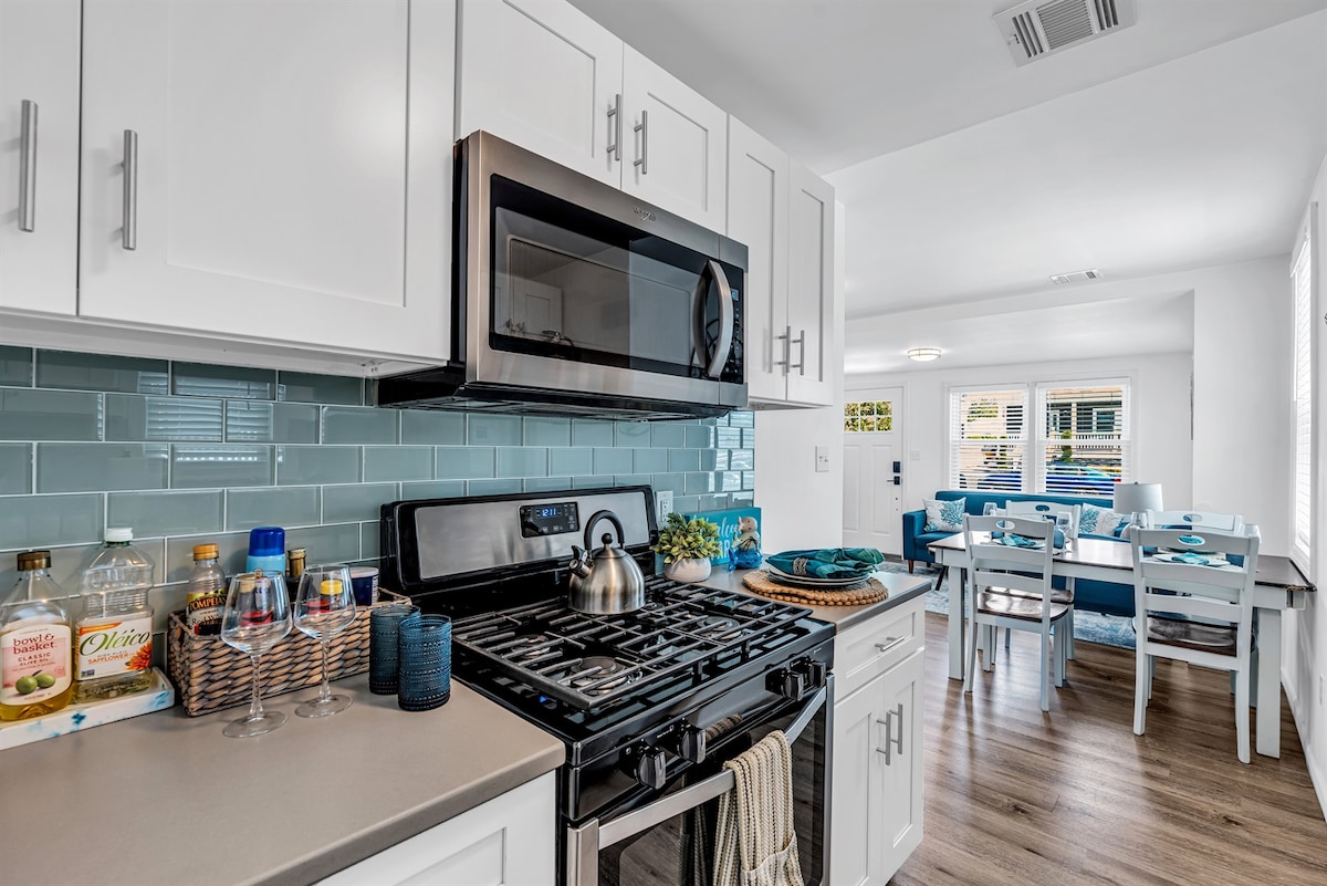 Separat, renoverad, sanerad stuga som rymmer 4. 1bd/1ba backhouse med ett fullt sovrum (queen bed) och vardagsrummet har läderbäddsoffa (queen). Entrén till stugan har en veranda för morgonkaffe eller kvällscocktail. Fullt utrustat kök för att laga mat och förbereda mat för stranden. 42-tums TV och gratis Wifi. Arbetsyta med skrivbord, stol, bildskärm. Luftkonditionering/värme i hela stugan. 2 strandpass, badhanddukar, strandstolar. Gott om gatuparkering.