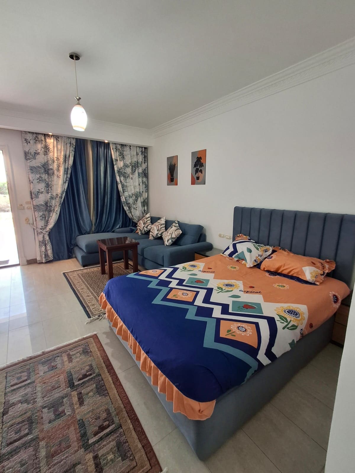 Elegant studio att hyra i det exklusiva Sharm Hills-området, fullt möblerad med en modern design och ett fullt utrustat kök. Inkluderar luftkonditionering, tvättmaskin och TV. Har en härlig utsikt och en privat trädgård, med fullständig tillgång till poolen och rekreationsanläggningar inom området. Perfekt för korta eller långa vistelser