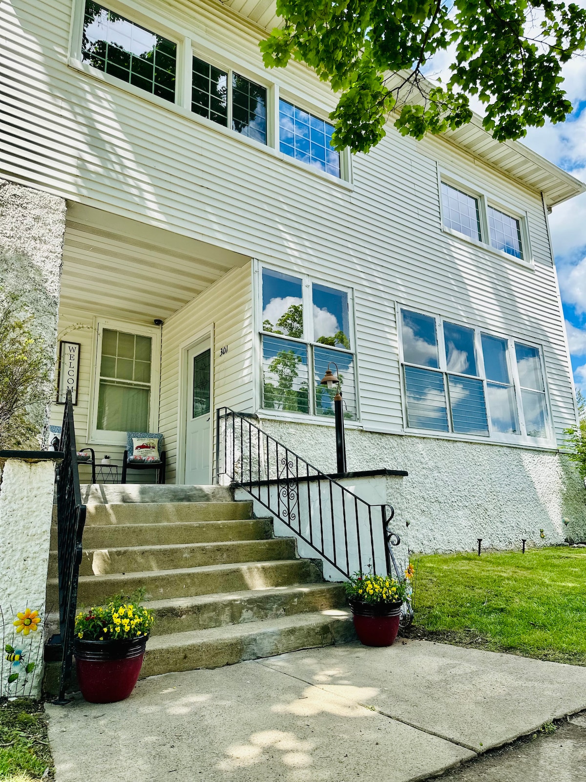 Oslagbart läge mindre än 1/2 mile från 9th Street båtramp, 9th Street Beach och Forest Park. Även idealisk för dem som deltar i evenemang på Chautauqua, eller Sunken Gardens. Njut av en kingsize-säng och ett stort badrum med jacuzzi, ett loft med en dubbelsäng och en balkong med utsikt över sjön, och ett annat sovrum med en dubbelsäng med utsikt över den rymliga bakgården där rådjur kommer för att äta. Vårt mysiga vardagsrum har en gaskamin. Uppfarten rymmer båtvagnar.