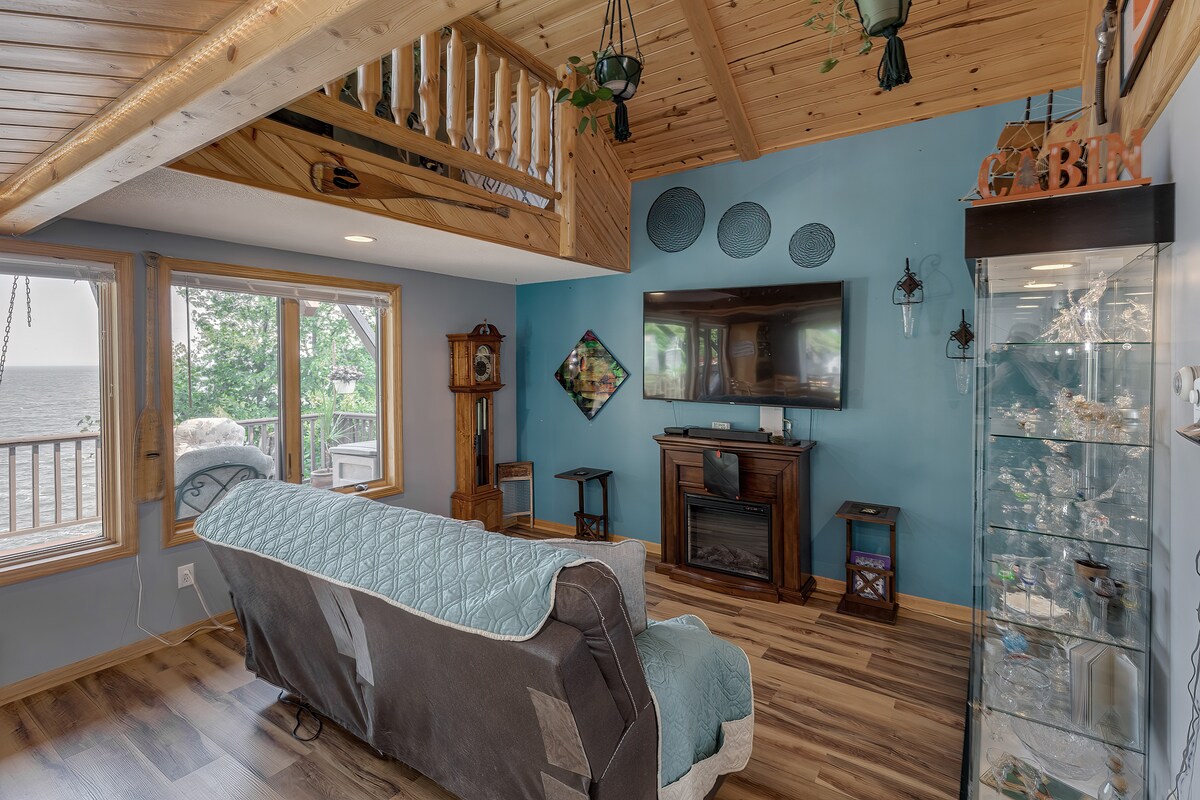 Nyrenoverat boende vid sjön på tre våningar. Tallpaneler överallt. Nästan 1 600 kvadratfot för att koppla av och njuta av livet vid sjön. Ett sovrum och badrum på nedervåningen. Huvudvåningen består av vardagsrum med utsikt över sjön, kök och matplats. Översta våningen är det stora sovrummet och badrummet. Den har välvda tak och en fönstervägg med utsikt över sjön. Köket har de typiska apparaterna: kylskåp, spis, 2 mikrovågsugnar och en diskmaskin.