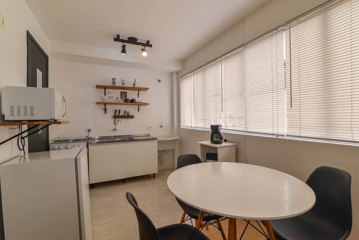 Vacker lägenhet belägen i hjärtat av staden. Nära det bohemiska grannskapet Batel, denna plats räknar med massor av butiker och gallerior, såsom Shopping Crystal och Shopping Pátio Batel, Rua 24 horas. Perfekt för två personer, det har ett vardagsrum/matplats, ett sovrum, ett badrum och ett fullt utrustat kök. Utrymmet räknas också med: Wi-fi, Smart TV, luftkonditionering varmt och kallt, varmt och kallt vatten i köket och badrummet. Vi tillhandahåller sängkläder och badlakan.