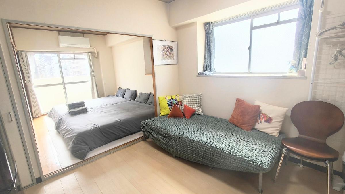 12 minuter med tåg från Nagoya Station | 2 minuters promenad från stationen | 20 minuter med bil från Legoland | Parkeringsplats för 1 bil | 2 sovrum och vardagsrum | Tyst och elegant designat utrymme