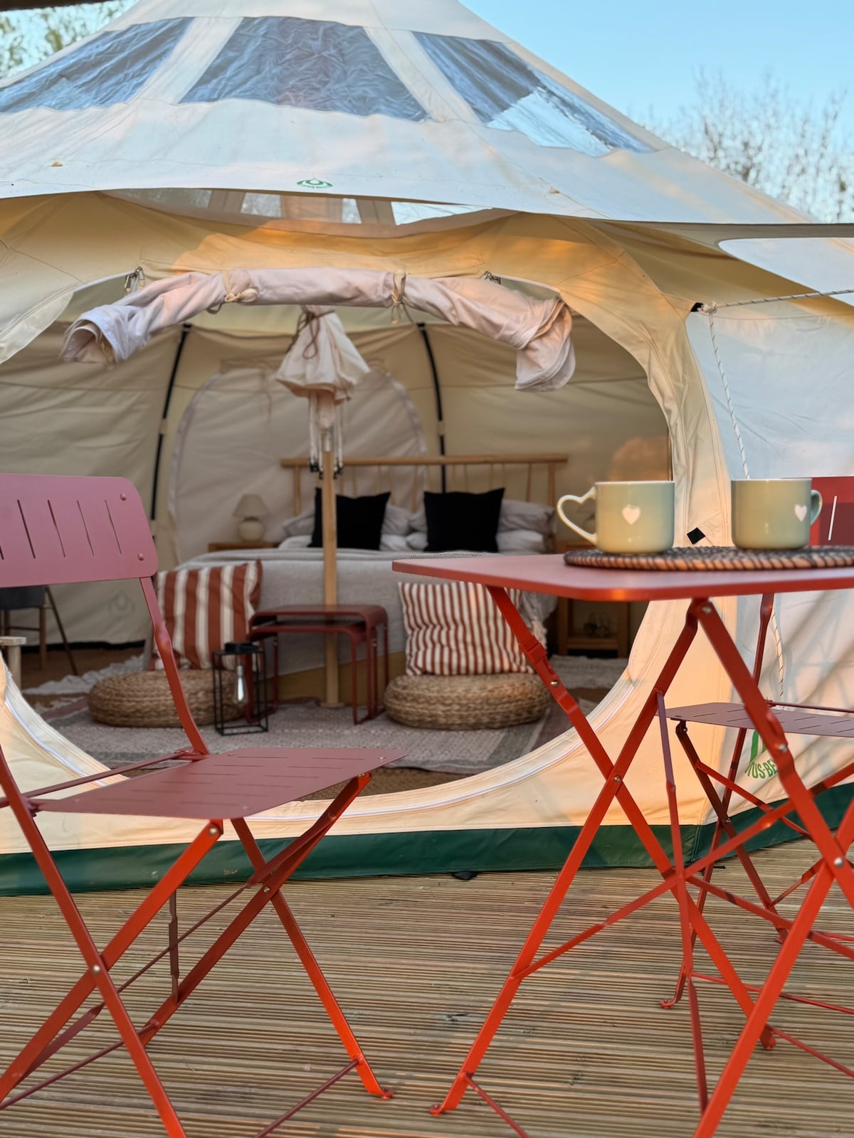 Fly till naturen utan att offra komfort i vårt vackert inredda 5 meter klocktält. Inbäddat i en lugn del av platsen, och med otrolig utsikt erbjuder denna glamingupplevelse den perfekta balansen mellan rustik charm och moderna bekvämligheter. klocktältet ligger på en del av south view farm pop up campsite Vårt klocktält har en dubbelsäng som rymmer 2 men ytterligare gäster är välkomna till en liten extra kostnad vi tillhandahåller två enkla bekväma campingbäddar gäster behöver bara ta med sina egna sängkläder