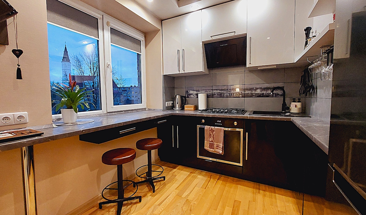 Mysig 3-rums lägenhet i hjärtat av Šiauliai med en öppen spis och en vacker utsikt över katedralen. Bara några minuter från de viktigaste sevärdheterna i staden, butiker, kaféer, barer och restauranger. Trevliga promenader och underhållning nära sjön Talkša.