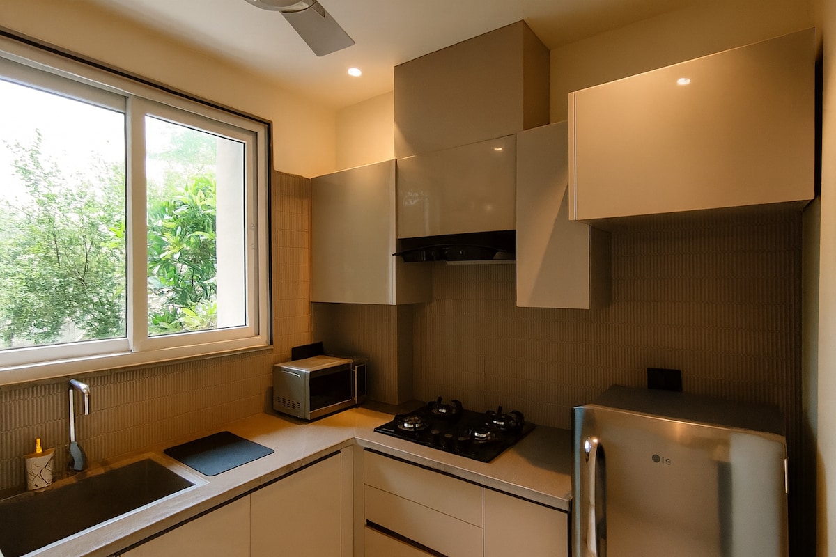 Welcome to The Oak Shore - Fully equipped 1 BHK with all amenities for both short & long stays. Centrally located in the corporate hub of Gurgaon, just 1 km from Golf Course Rd, 2 km from Cyber City. Easy access to IGI airport. ✨Why us: • Equipped kitchen, tea/coffee essentials, complimentary access to OTT platforms- Netflix & Prime Video & games • No extra charges for early check-in or late check-out (based on availability) • Private Balcony • Spacious Living Room • High-speed Wi-Fi & Workspace