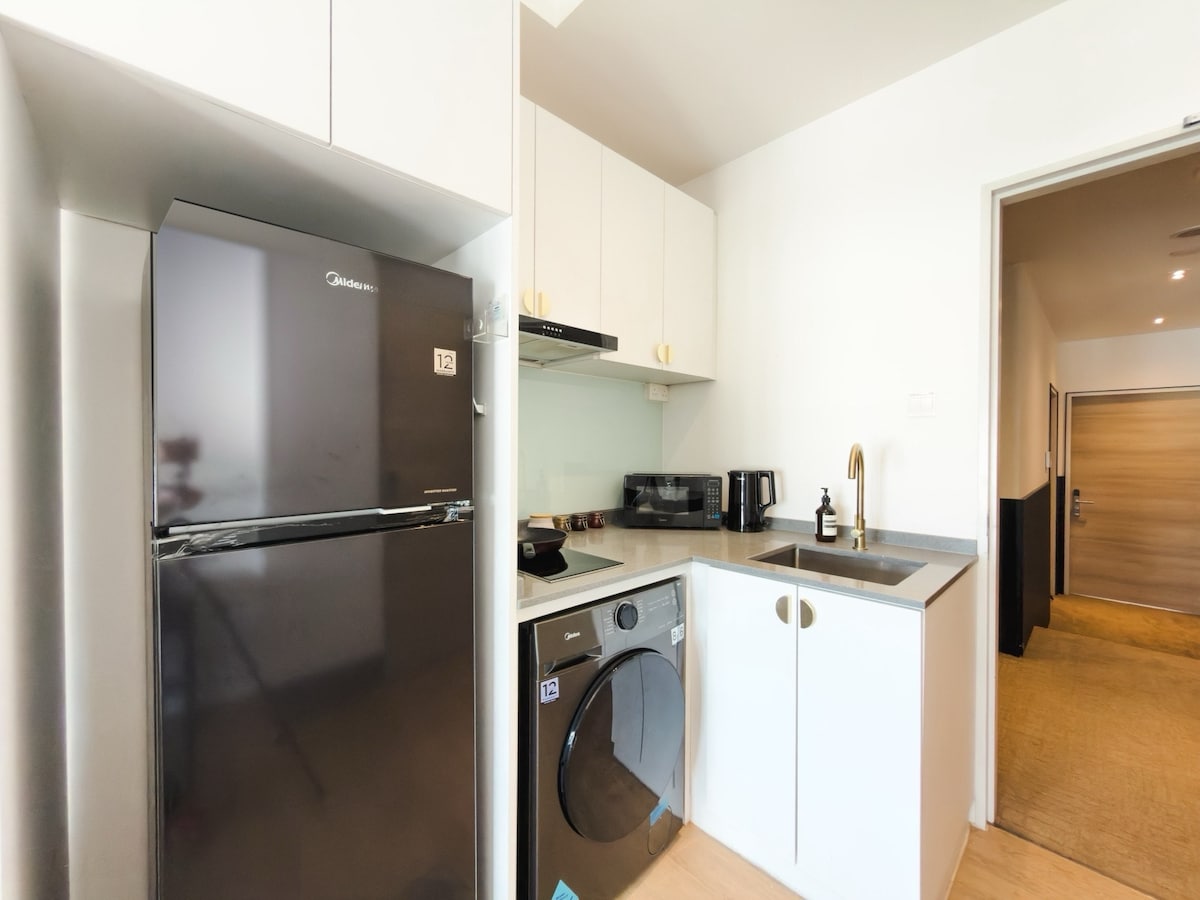 Signature-svit med två sovrum ~48 kvm Maximal beläggning 6 personer En ljus och rymlig lägenhet med service i Bugis med generösa vardagsrum, perfekt för familjer eller grupper som vill bo tillsammans bekvämt medan de njuter av Singapore från det pulserande hjärtat av Bugis. Höghastighets WiFi 2 Dubbelsängar Bäddsoffa Luftkonditionering Badrum Kök Tvättmaskin och torktumlare i rummet Kylskåp på rummet Mikrovågsugn på rummet Elektrisk vattenkokare på rummet Smart-tv Hårtork