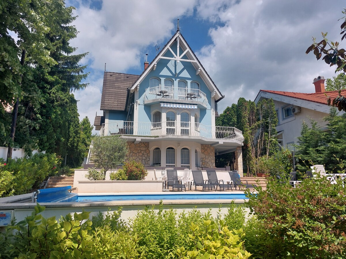 Beläget i centrum av Balatonfüred, 400 meter från stranden och Tagore-promenaden, väntar vårt fullt renoverade pensionat på sina gäster med 6 sovrum och 6 badrum (max 19 personer), en trädgård med pool och solterrass. De luftkonditionerade rummen är utrustade med ett kylskåp. Det finns ett gemensamt pentry med tvättmaskin, rymlig matsal och välutrustat kök. Närliggande restauranger, butiker, cykelväg, hamn. Sluten parkering och gratis WIFI tillhandahålls.