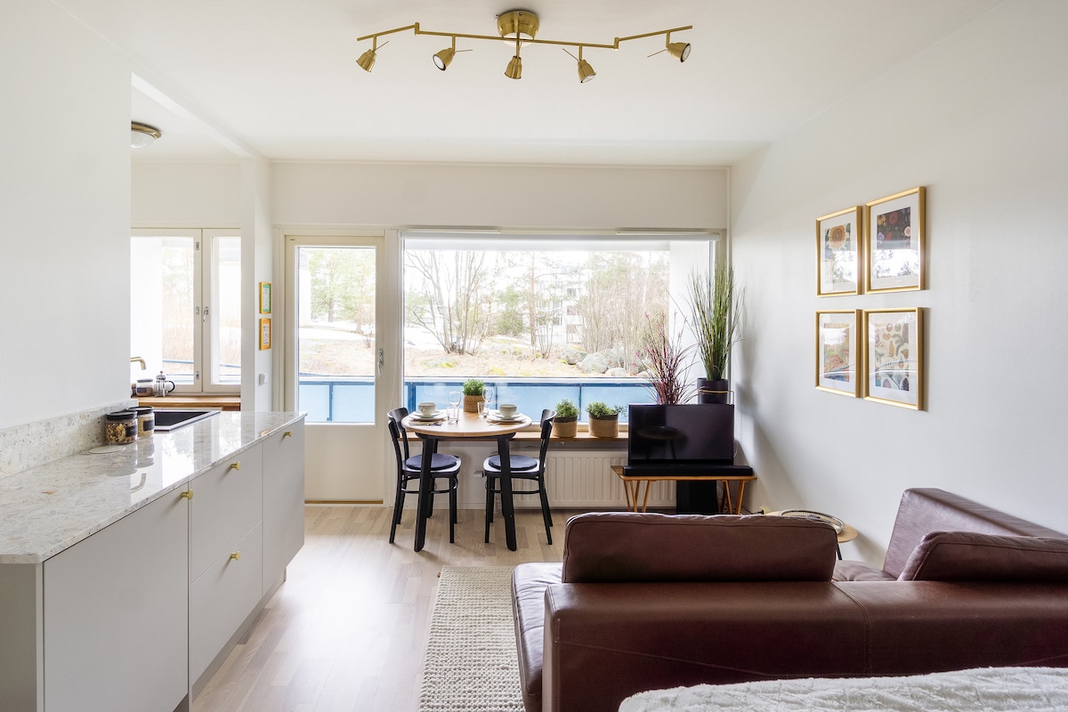 En elegant ny fräsch ettor med stads- och havsutsikt. Stor balkong mot söder. Fönster från golv till tak mot öster och söder. Ungt, trendigt Kalasatama/Sompasaari-område i Helsingfors. Lägenheten ligger vid havet bara 5 minuters promenad från Mustikkamas sandstränder, natur och sportterräng. I närheten av köpcentret Redi, Högholms djurpark och restaurang- och evenemangshuset Teurastamo. Busshållplats 20 meter bort och närmaste tunnelbanestation är Kalasatama.