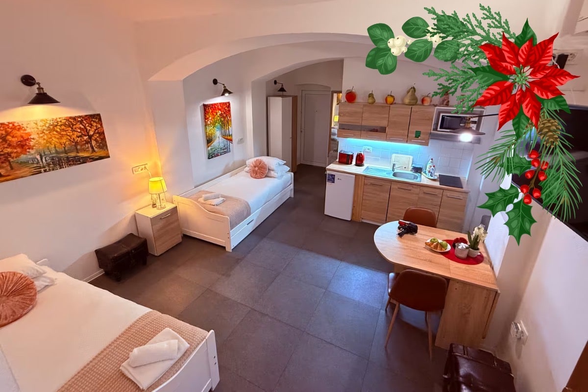 Denna rymliga, oklanderliga och mysiga lägenhet kommer att vara din oas i hjärtat av staden. Oslagbart lugnt läge med gångavstånd till Triple & Dragon Bridge och Central Market. Omgiven av många fantastiska restauranger, kaféer, grill och barer. Bara några minuter från huvudtåg- och busstationen. Bekväm dubbelsäng (160 cm) och badrum med dusch. Ett fullt utrustat kök med kylskåp. Sängkläder, handdukar, toalettartiklar och tvättmaskin tillhandahålls. Gratis garage