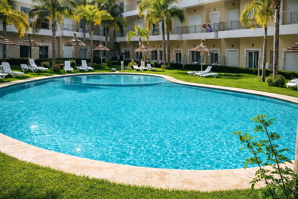 Välkommen till vår härliga lägenhet! Beläget bara en kort 20 minuters promenad från den vackra stranden, är det bara 5 minuters bilresa om du föredrar att ta bilen. För dem som är angelägna om att utforska är tågstationen en bekväm 5 minuters promenad, vilket gör det enkelt att nå dina önskade destinationer. Du kommer också att uppskatta det faktum att Rabat ligger bara 20 minuters bilresa bort. Många kommer hit och säger att de verkligen gillar det. (Poolen är öppen varje dag utom måndag)