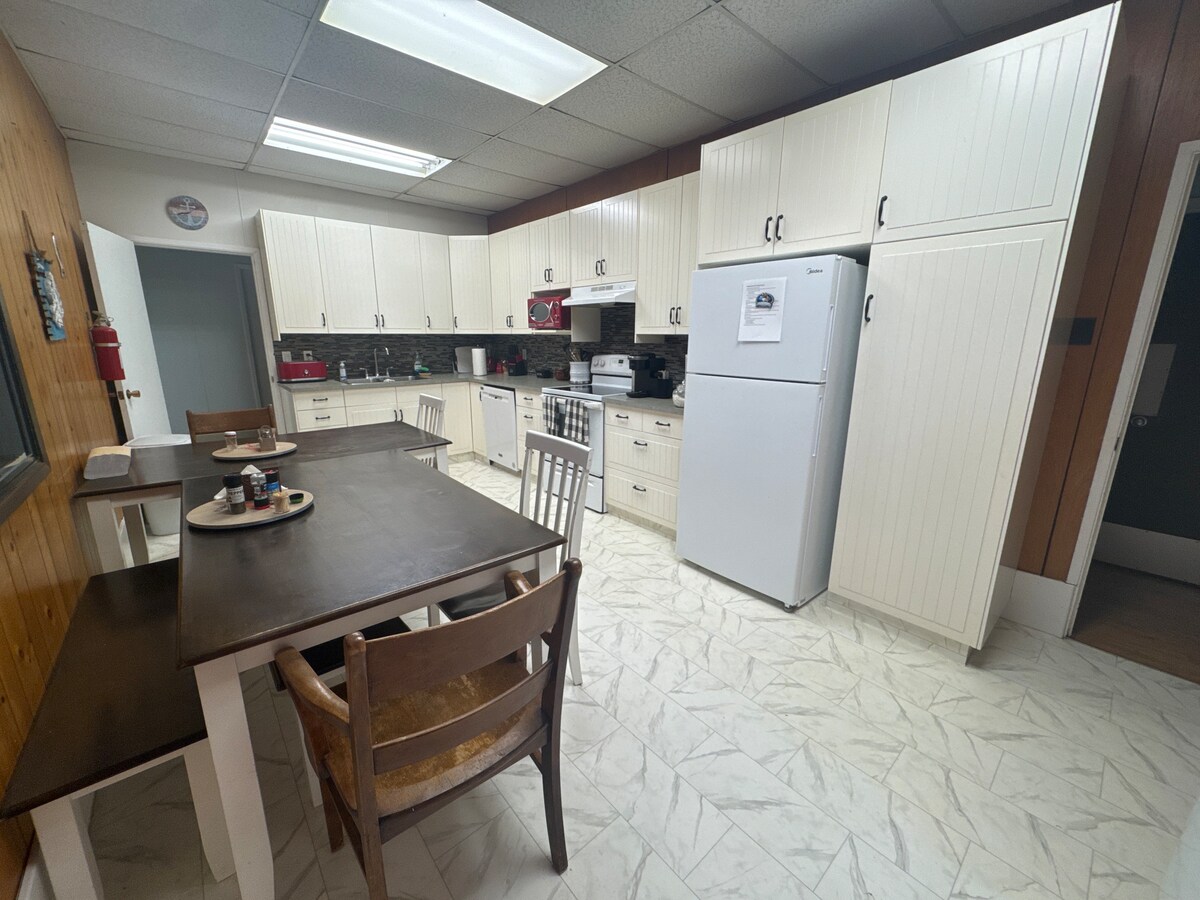 379 Blaine Shaw Rd. Centrum av staden på gångavstånd till livsmedelsbutik, golfbana och flygplats. 1 kvarter från stranden. 3 sovrum med 3 queen-sängar och våningssäng. Vardagsrum, läsrum med mysig vedspis och TV-rum. Tillgänglig utrustningsförvaring.