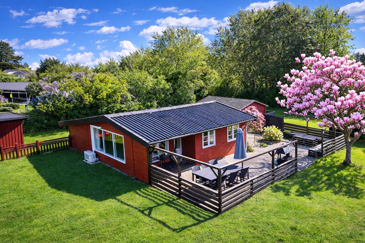 Härlig sommarstuga från 2009, 250 meter till en vacker barnvänlig sandstrand. 100 meter till mataffären. Mindre sovrum med dubbelsäng, större barnrum med 3 enkelsängar. Dessutom finns det två madrasser Stort badrum med tvättmaskin och torktumlare. Läckert kök, med all utrustning, öppen anslutning till vardagsrummet. Wifi + Chromecast i båda TV-apparaterna Vacker inhägnad trädgård med studsmatta, terrass med loungemöbler, gasolgrill (5 euro). Hundar är välkomna, inte på möblerna! Laddningsstativ 3,50 kr per kWh Bastu 250 DKK per dag