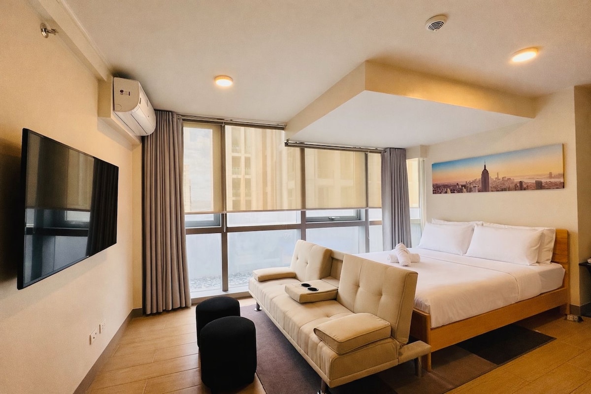 Bo i denna elegant designade lägenhet med direkt tillgång till UPTOWN Mall, perfekt för upp till 3 gäster. Koppla av i en rymlig 36 kvm enhet med en dubbelsäng, bäddsoffa, 100 Mbps SNABBT INTERNET, kabel-TV och Netflix för din underhållning. Dra fördel av bekvämligheten med nyckellös entré och tillgång till förstklassiga bekvämligheter — pool, takterrass, m.m. Allt du behöver är bara några steg bort: gallerior, barer, livsmedel. Dessutom, GRATIS PARKERING, en sällsynt förmån i BGC. Boka nu för en oslagbar vistelse!