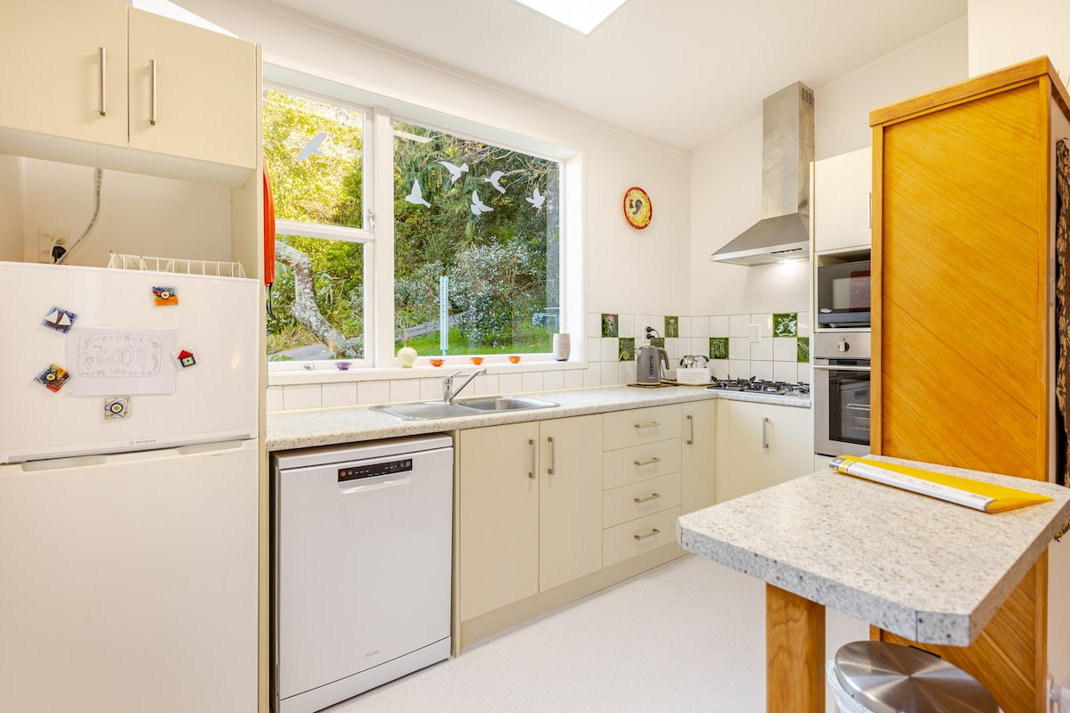 En historisk stuga i en skyddad dell på landet nära Makara Beach, helt restaurerad Te whare iti ligger 10-15 minuters promenad från den robusta Makara-kusten och ungefär 35 minuter från Wellington CBD. Den bevarade exteriören omsluter mycket rena, varma och bekväma moderna bekvämligheter. Viktigt — du måste tillhandahålla din egen transport eftersom det inte finns någon kollektivtrafik till Makara från Karori närmaste förort, ca. 9,5 km bort. Makara är äkta NZ landsbygd med en blåsig, smal väg att matcha!.