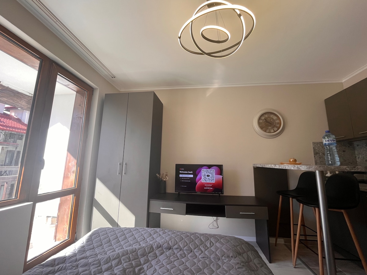 A43a is a comfortable studio with breathtaking view to the ski slopes and Snezhanka Tower. It is located in GreenLife Complex. From the window you have direct view to the slopes, the pines and the sky. The biggest advantage of the hotel is that you have direct access to the ski slope. The place is recently renovated and equipped with all necessary amenities. a43a is a studio apartment where 2 to 4 person can sleep comfortably.