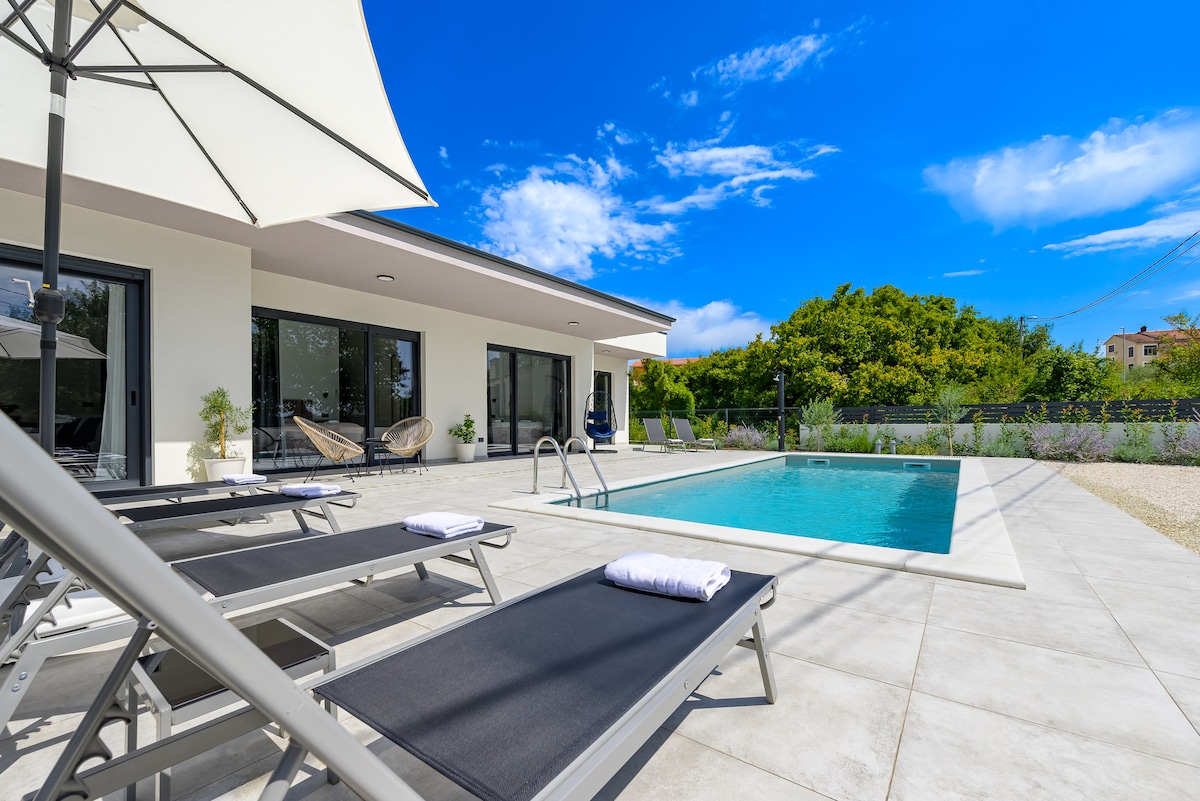 Stilren villa nära Rovinj med bildvärdig pool, nedsänkt i bubbelpool, bastu. Vakna upp till frodig, panoramautsikt över dalen. Par och familjevänligt, en kort bilresa till äventyrspark, Brijuni National Park, dinopark, medeltida städer och lokala rätter. Det är en sann grön tillflyktsort för alla som vill komma tillbaka till naturen med all komfort i det moderna livet. Fullt utrustat för matlagning och underhållning i 2600 m2 trädgård (fotboll, speedball, badminton och pool kul) för dina barn och nära och kära att njuta av.