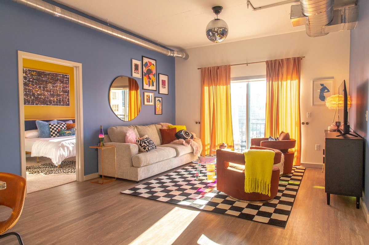 En 10 minuters promenad till Broadway, Bridgestone Arena & Music City Center, denna rymliga lägenhet är värd för lyxiga bekvämligheter, kurerade retrodesign och mördande solnedgångsutsikt. Båda sovrummen har dubbelsängar och walk-in garderober med en queen sovsoffa i vardagsrummet för extra gäster! Gäster har fullständig tillgång till den uppvärmda poolen, spelrummet och gymmet! Poolhanddukar och kylväska tillhandahålls! Betald parkering tillgänglig PÅ PLATS!