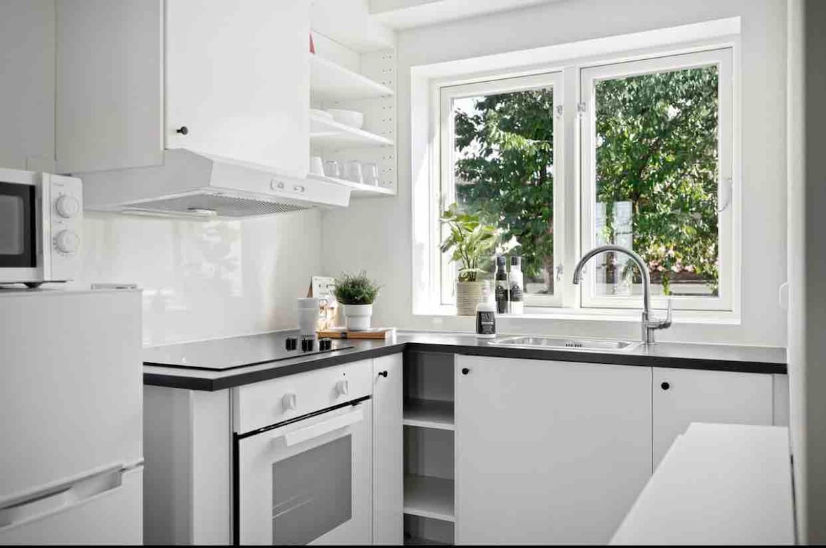 Njut av en upplevelse på en plats i ett centralt läge. kort avstånd till stadens centrum, bra bussförbindelser och butik tvärs över gatan. 41 kvm, 5 minuters promenad till stadens centrum, 1 minut för att handla, 5 minuter till rema och joker, vaktapotek 3 min. 1 sovrum med dubbelsäng, eller möjlighet att använda en resesäng. Busshållplats tvärs över gatan 1 min. Flygbussen går direkt till flygplatsen, stannar rakt nerför. Centralt, samtidigt så avskilt att du inte hör buller på helgerna. 5 minuter till teatern. 6 minuter till buss och tågstation