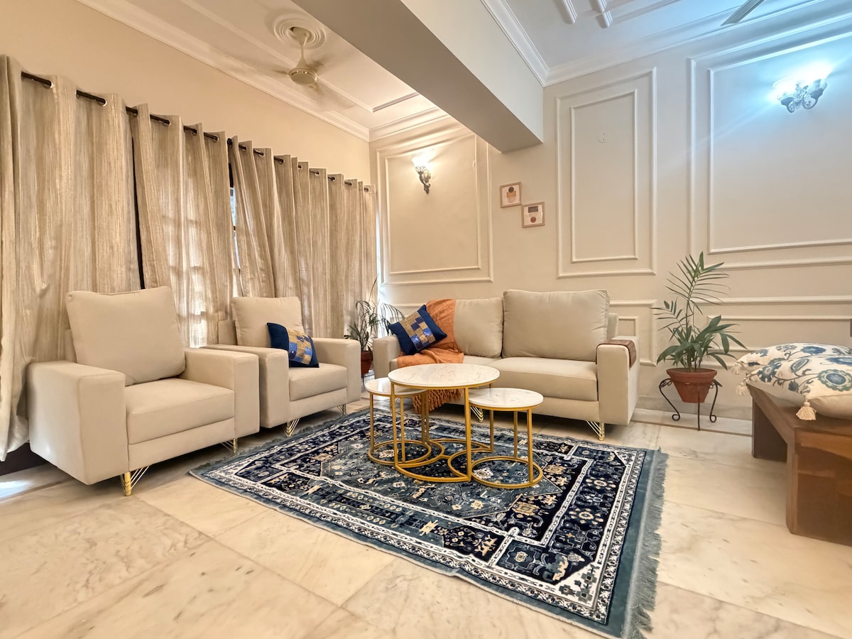 Perfekt plats för turister, bröllopsgäster för HALDI n MAHENDI-funktioner med lätt musik och ljud. Kändisfotoshoot destination. Ett hem hemifrån. 8 sovrum med delade 8 ACs, hög effekt växelriktare och generator, 24 bäddar, 8 anslutna tvättrum, 2 vardagsrum, 4 kök (2 på varje våning) *oberoende *mindre än 5 minuter från Sukhna Lake, Rock Garden, Market, high court, golfklubb, restaurang, bar, gym, bra klubb. #Ingen musik eller högt ljud tillåtet efter 21:00 Zomato, Blinkit tillgänglig
