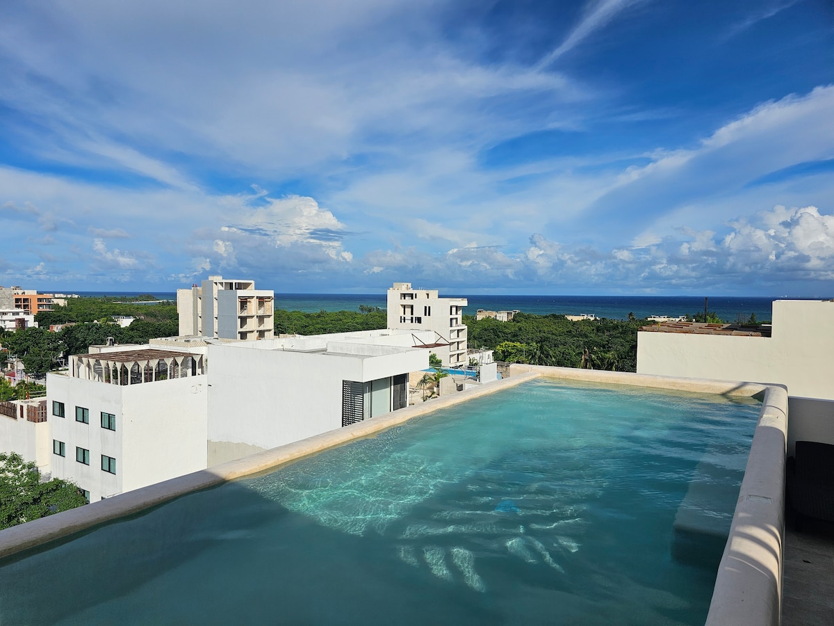 Professionellt designad modern och bekväm svit med ett läge som är oöverträffat. Den vackra vita sanden och det kristallklara varma vattnet i Riviera Maya ligger några steg bort. Den berömda 5th Ave. Shopping District ligger ett kvarter bort med allt du någonsin skulle behöva. Cyklar ingår så att du kan njuta av en kort tur till många stränder. Efter en dag av äventyr, njut av din lyxsvit, privat balkong med stads- och havsutsikt eller njut av takpoolen med panoramautsikt 360 grader.