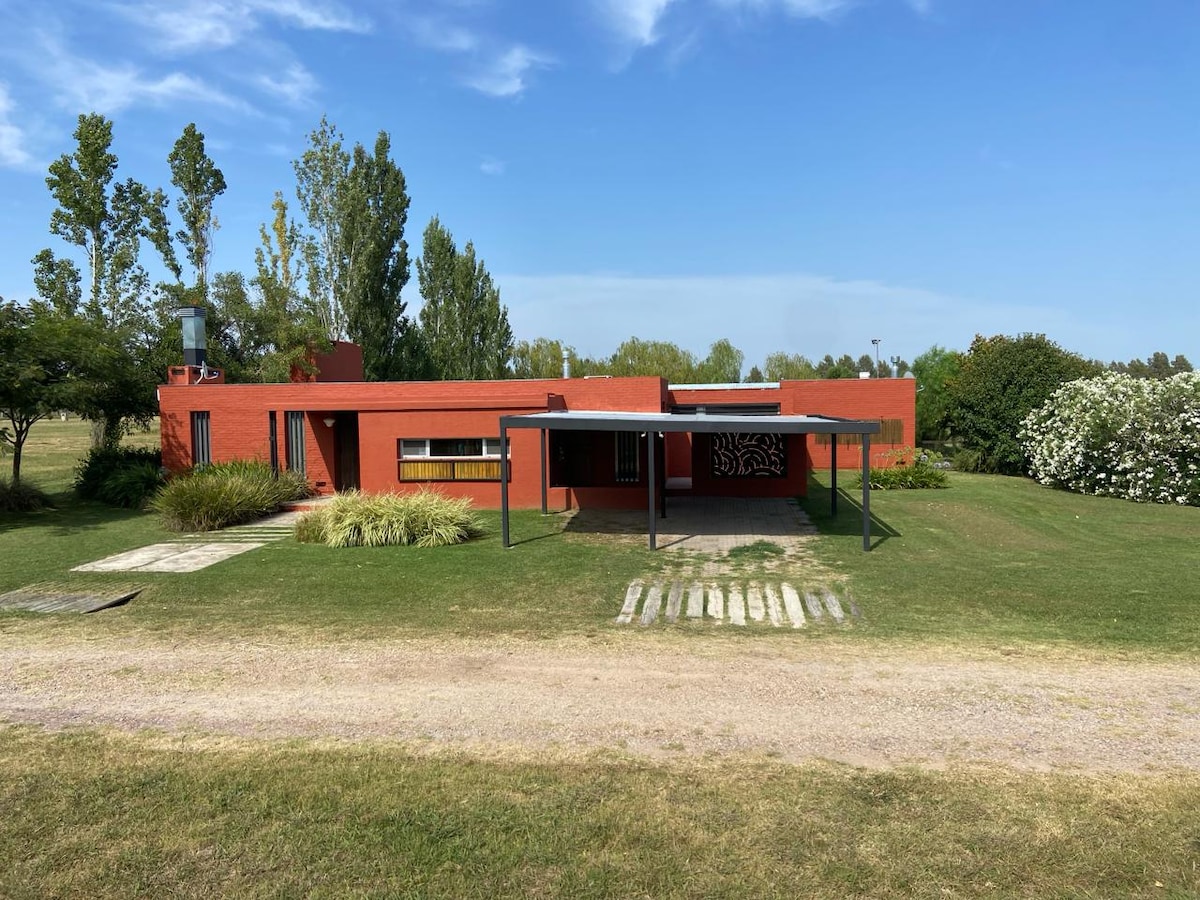 Rymligt naturligt utrymme på 3200 m2 och ett rymligt hus med ett sovrum. Mycket nära staden Villa Ruiz, San Andrés de Giles. Perfekt för att njuta av naturen och koppla av. Det exponerade tegelhuset är av en subtil arkitektur, integrerad med miljön i Pampa Argentina. Den har ett rum med en dubbelsäng, badrum, kök utrustat med fullt porslin, elektrisk ugn, keramikhäll, vardagsrum-matsal, TV med chromecast, grill, salamander, wifi och pool.
