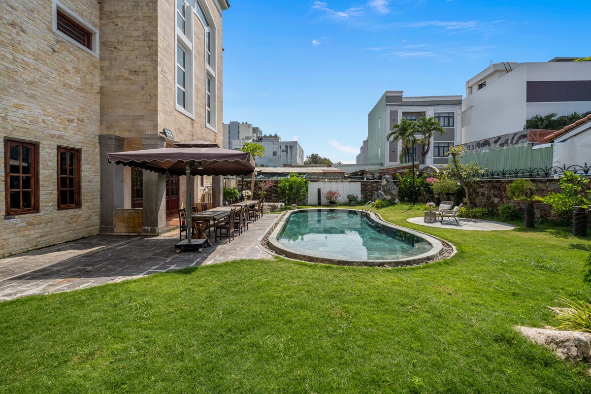 Hej Detta är en ny villa som slutfördes i augusti 2025.🩵 Jag arbetade som hotellvärd på ett 5-stjärnigt hotell och jag ville skapa mitt eget boende, så jag öppnade detta ställe :) (* * Denna villa är byggd på fjärde våningen. Det kanske inte är lämpligt för äldre och barn, så se fotot av trappan.) Det är en lyxig poolvilla som ligger i centrum av Da Nang, och en 6 minuters promenad från My Khe Beach.☺️ Det finns många kaféer, restauranger, närbutiker och apotek i närheten. Det har 6 sovrum (6 sängar), en pool, en våtbastu, en strålprojektor och en stor skärm, och en uteterrass, så det är lämpligt för gruppresor.🫶 Jag vill ge dig bekvämligheter du är van vid hemifrån under din resa. Vi kommer att belöna dem som besöker vårt boende med rena och bekväma sängkläder, behaglig inomhusluft och vänliga svar. Tack:) * * Försiktighetsåtgärder * * - Rök inte inomhus. - Ät inte på sängen. Om täcket är förorenat tillkommer en extra avgift. - För säkerhetens skull är en övervakningskamera installerad på höger sida av ingången utanför boendet.