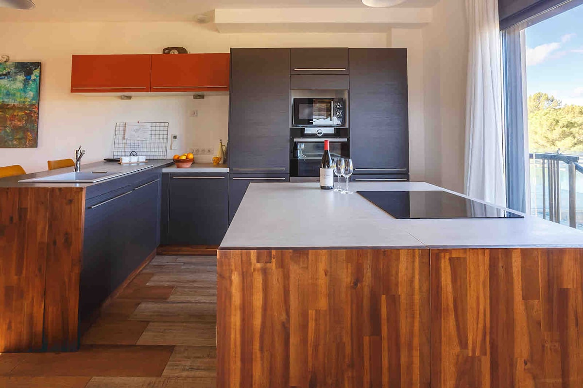 Vid foten av medeltidsstaden erbjuder vårt charmiga tvåvåningshus på 110 m² en privat 40 m² terrass, en halvskuggad pool och fantastisk panoramautsikt. Denna fridfulla tillflyktsort har fått 5 stjärnor av Gîtes de France och rymmer bekvämt upp till sex gäster. Koppla av på den upphängda terrassen medan du njuter av den fantastiska utsikten över medeltidsstaden. För en romantisk kväll, ät middag med levande ljus under stjärnorna, med den upplysta fästningen som din bakgrund.