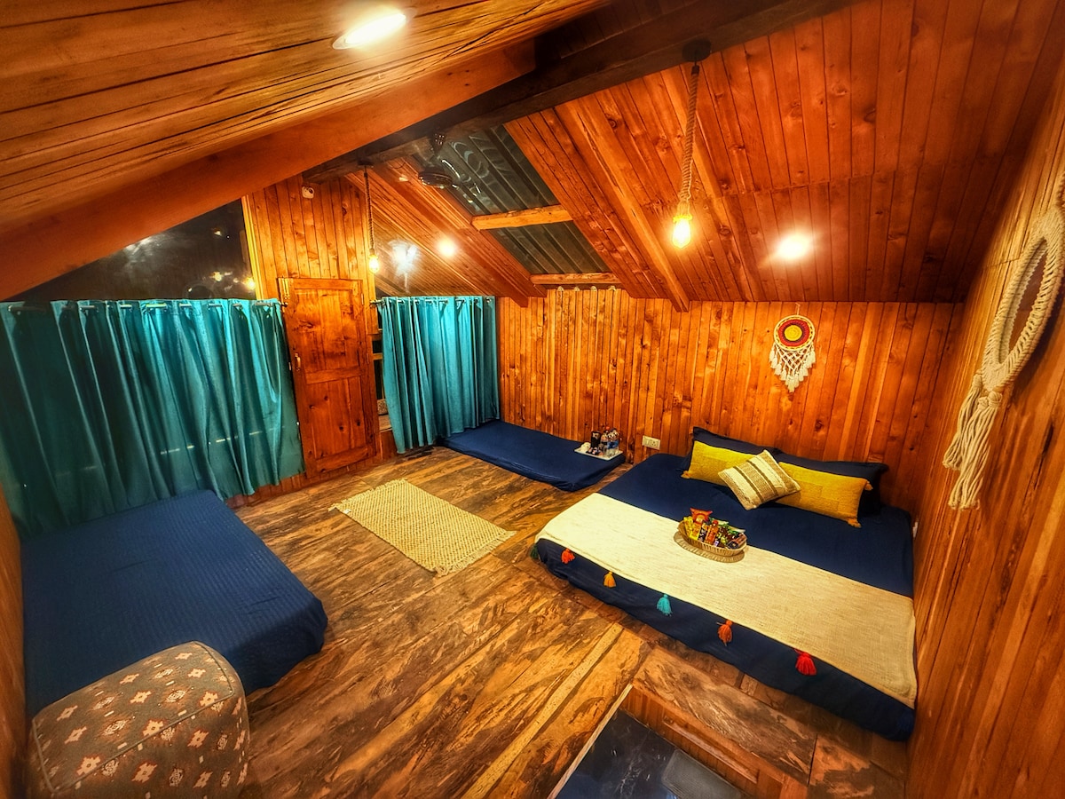 Khwaab Duplexes ger dig svaret på vad som finns bakom Jibhi. 4 mysiga duplexrum i trä med vindsvåning som passar för familj, vänner och grupper, med en egen matplats och köksyta och tillgång till sjön på 50 m. Detta är det totala beloppet för alla fyra rummen; bokningar av enkelrum är också tillgängliga. Vi organiserar också ovanliga vandringsupplevelser. Jag är glad över att få vara värd för er :)