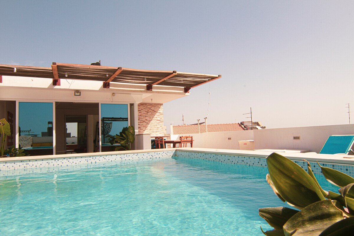 Studio på terrassen i byggnaden med dubbelsäng för två personer, soffor, TV inklusive nextflix, gratis wifi, musik stereo, kylskåp och kök apparater. Badrum del av terrassen utan uppvärmt vatten. Terrassen innehåller en pool med endast gäst tillgång (inkluderar inte besökare), gym utrustning, terrassmöbler för sola och avkoppling, utomhus kök och kolgrill.