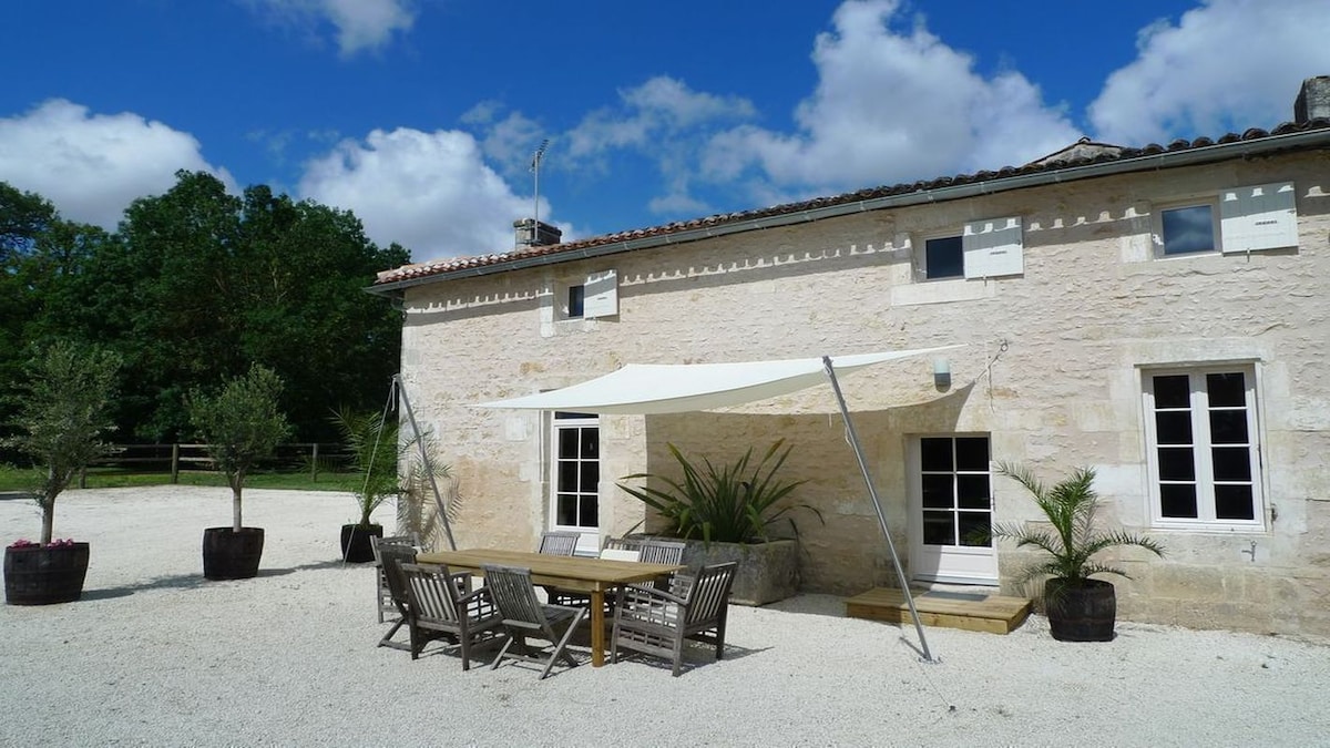 I hjärtat av triangeln Royan-Saintes-Rochefort, upptäck en fridfull landsbygd fristad bara 25 km från stränderna. Denna rymliga 110 m² stora stuga ligger på en 2 hektar stor vingård från 1800-talet. Njut av din egen terrass och slutna trädgård. Från mitten av april till början av oktober kan du ta ett dopp i den 27 °C uppvärmda saltvattenspoolen, som delas med endast två andra gäster. Ett riktigt paradis för naturälskare och lugn.