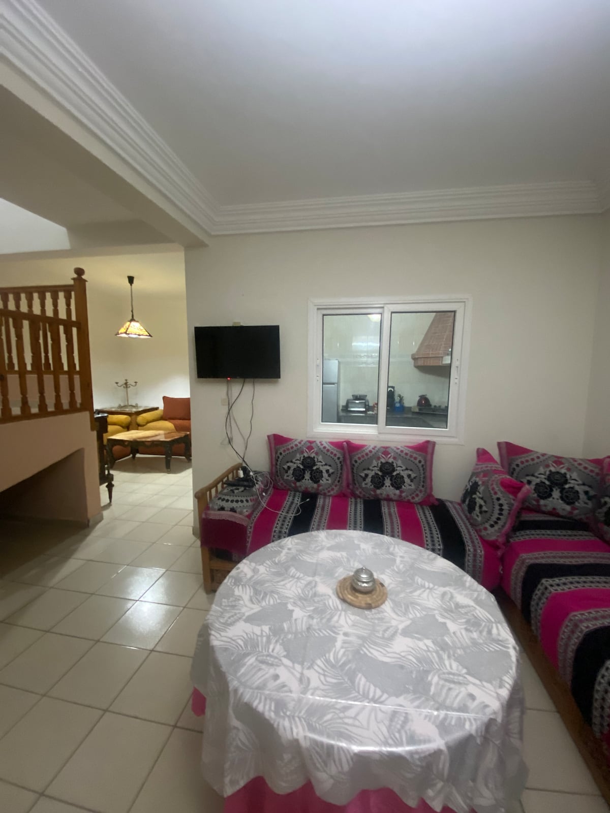 Upplev charmen i marockansk tradition i en fantastisk lägenhet Välkommen till denna vackert designade marockanska lägenhet, där tradition möter komfort. Belägen nära flygplatsen Ett rymligt vardagsrum med intrikata marockanska zellige-kakelplattor, gröna plyschsittplatser och utsökt inredning. Traditionellt hantverk kombinerat med en mysig atmosfär, perfekt för avkoppling eller sociala sammankomster. Perfekt för familjer, par eller ensamresenärer som söker en unik kulturell tillflykt.