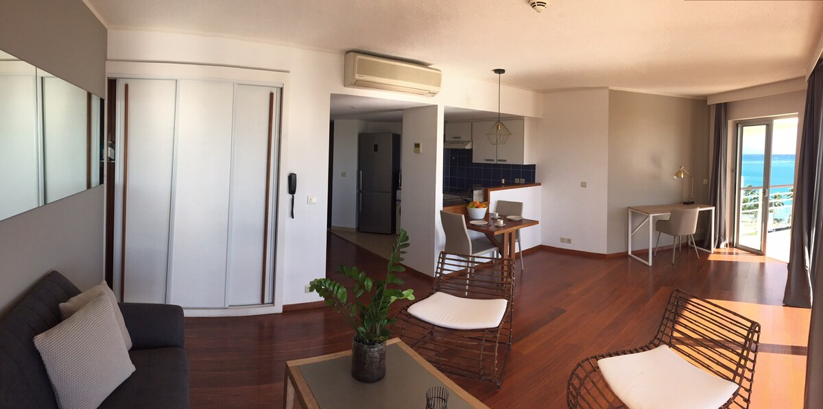 Detta eleganta och rymliga boende har utsikt över havet. Perfekt beläget i ett Ramada Plaza hotellbostad, vi är 5 minuters promenad till stränderna och alla bekvämligheter. Du kan njuta av en stor terrass som vetter mot havet och holmarna med fantastiska solnedgångar! Sovrumssida: en exceptionell säng finns i super king size kunglig madrass!
