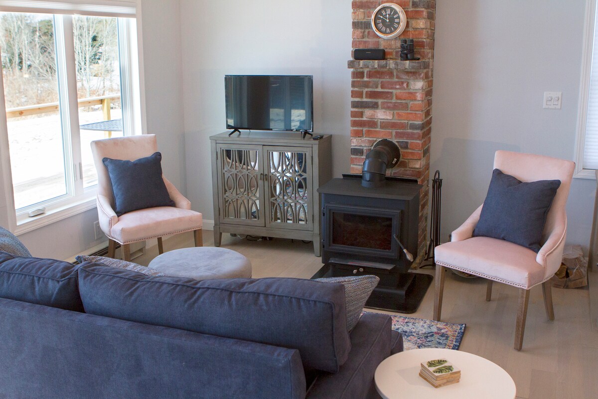 • Perfect for small families or couples, our signature A-Frame cabin features a modern interior gas burning fireplace, soaring ceilings, huge windows, stylish interiors, and all the comforts of home. • This cozy 1,100 square foot space comfortably accommodates up to four guests in two bedrooms (one with a King-size bed and the other with a Queen-size bed) and a shared bathroom. • 7 minute drive to downtown Freeport. • Proud to be ranked in the top 1% and voted Guest Favorite!