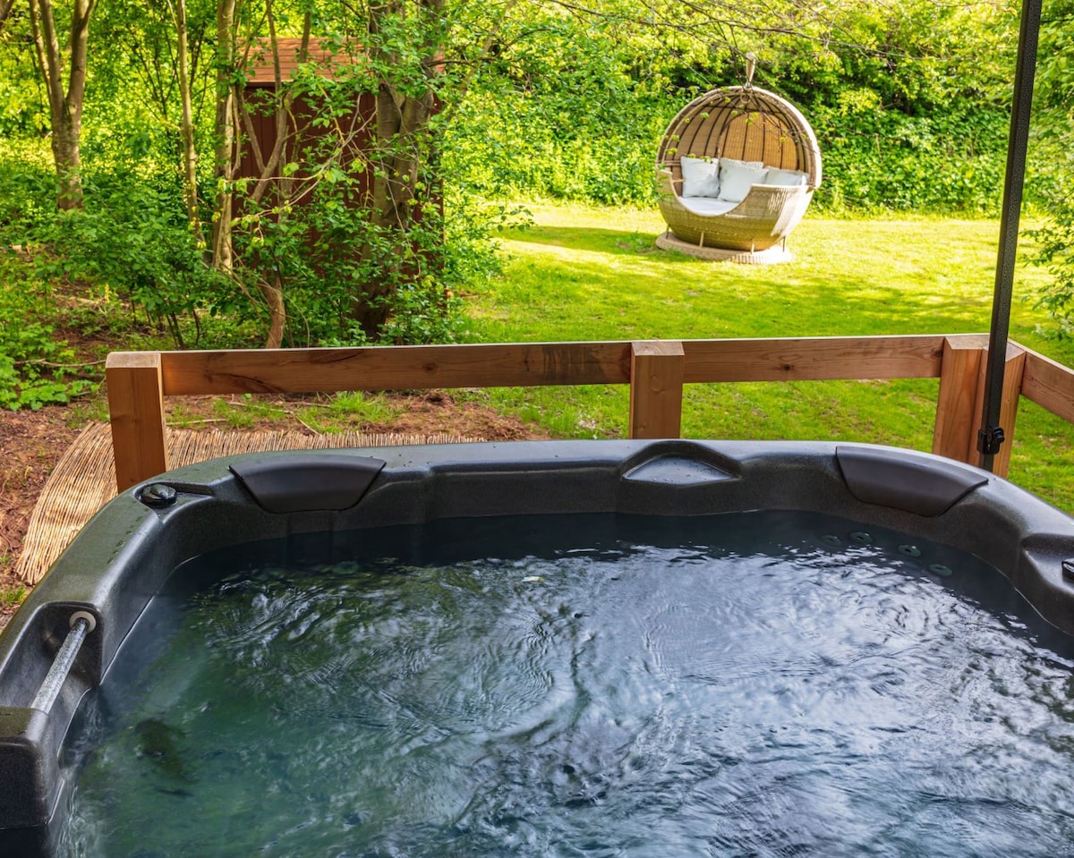 Swan Lodge, en av 2 lyxiga stugor på Hawthorn Hideaway par tillflyktsort inbäddad i en skog, vid vattnet. Det är fullt utrustat med en privat bubbelpool och inomhus- eller utomhusbio, vedspis, ensuite dusch, fullt utrustat kök, smart-TV, WiFi + ett trädgårdsområde med lyxig dagbädd + eldskål BBQ. Gratis deluxe frukostkorg och användning av bastu, ångbad + inomhus grillstuga. Extra inkluderar massage, privat middag med en privat kock, festpaket + mer.