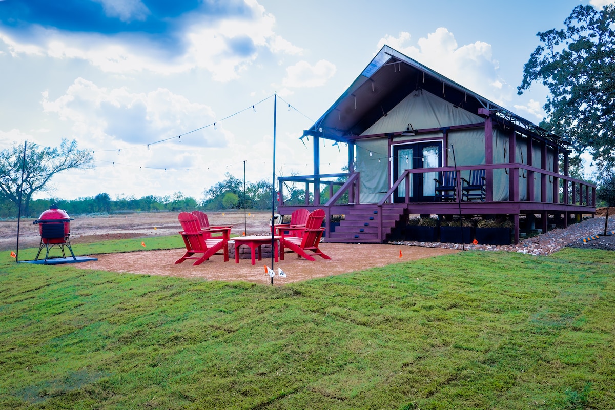 ✧Avskild 5 hektar safari: En äventyrlig tillflyktsort inom en 1 700 hektar exotisk djurtillflyktsort. ✧Glamping Tält: Helt isolerat, med luftkonditionering och värme för komfort året runt. Tillgång till✧ floden bara 3,5 miles från tältet: Privat plats vid Lampasas River för fiske, BYO kajak och djurskådning. ✧Stjärnskådning i en Dark Sky Zone: Koppla av under Texas stjärnor med hängmattor, sittplatser på däck och en eldstad. ✧Hållbar komfort utanför elnätet: Drivs av 95 % solenergi, med nivå 2 EV-laddning och varmt och kallt renat regnvatten.