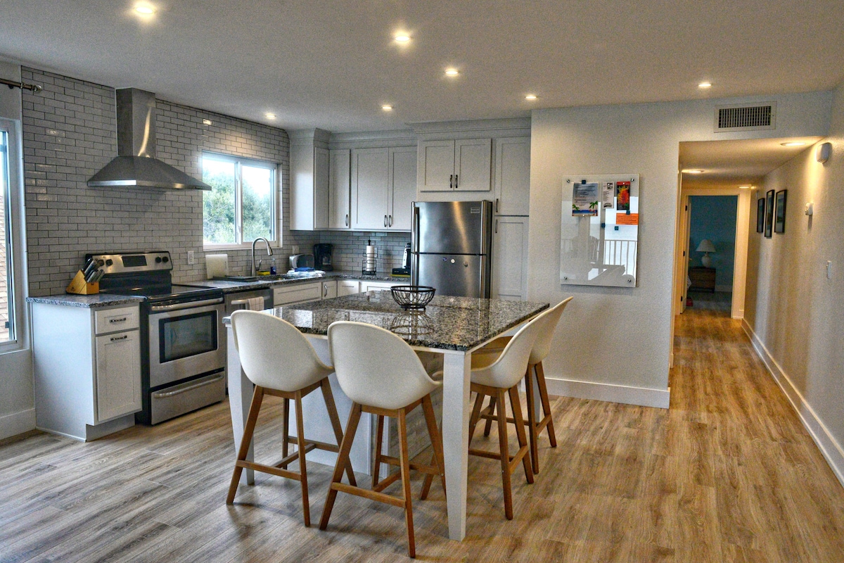 Kom och njut av din bit av paradiset på denna lyxiga, nyrenoverade strandlägenhet, bara 40 steg från stranden! Lägenheten har två sovrum med två privata badrum, och ett vardagsrum med ett extra halvt badrum. Det nyligen uppdaterade köket har nya rostfria vitvaror, bänkskivor i granit och en rymlig frukostbar. Vardagsrummet har en 51 tums TV och 2 utdragbara lädersoffor. Gratis privat parkering för två bilar. Strandstolar, paraplyer, handdukar och 2 cyklar ingår!