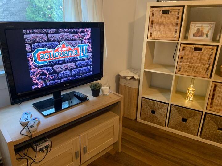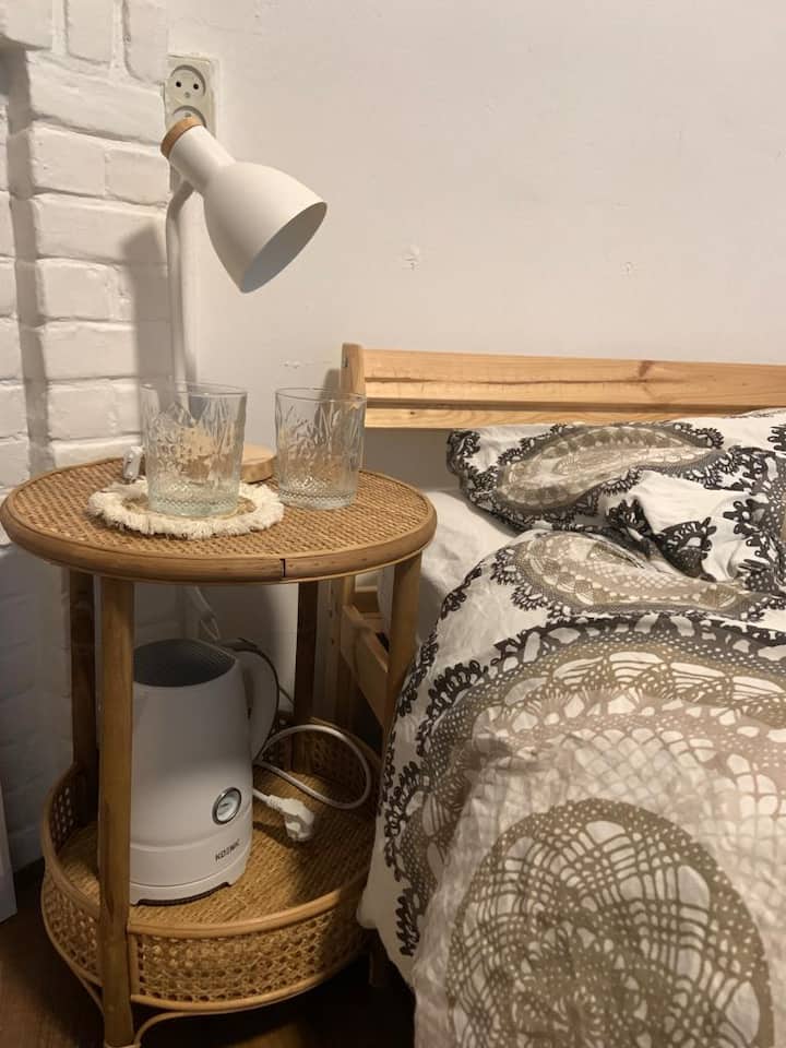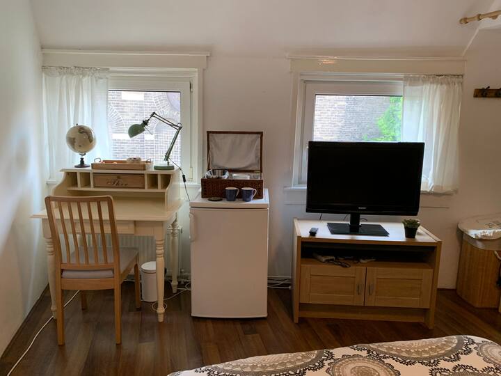 Ditt rum är ett rymligt och mysigt (holländskt: gezellig) rum utrustat med ett skrivbord för arbete/studier, en avkopplande säng, en TV med chromecast som du kan använda med din telefon eller via din bärbara dator, ett arkadspel, ett kylskåp för dina personliga förfriskningar, en vattenpanna för te/snabbkaffe/snacks som nudlar, lite köksutrustning och tillräckligt med utrymme för att fylla på dina kläder eller andra förnödenheter för en bekväm och bekväm tid under din vistelse.