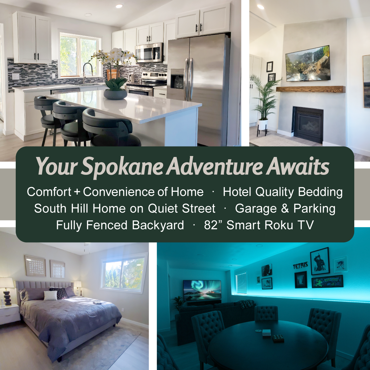 Nestled on a quiet ridge on the South Hill, our home has wonderful panoramic views of Downtown and Spokane Valley, and is conveniently located just 10-15 minutes from just about everything. Our home is themed around much-loved board games, with lots of fun decor, games included! It is excellent for larger groups or families, with a modern kitchen, office, multiple living areas, game/movie room, and a two-car garage. Enjoy a fully enclosed and private back yard, and sunsets off the back deck!