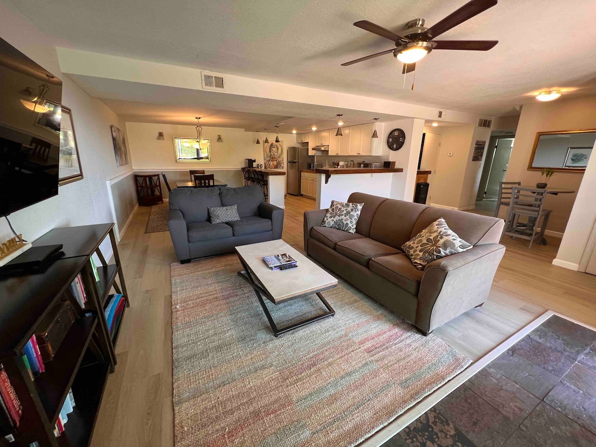 Rymlig 1 Bdrm Enhet: king bed, öppen spis, parkering