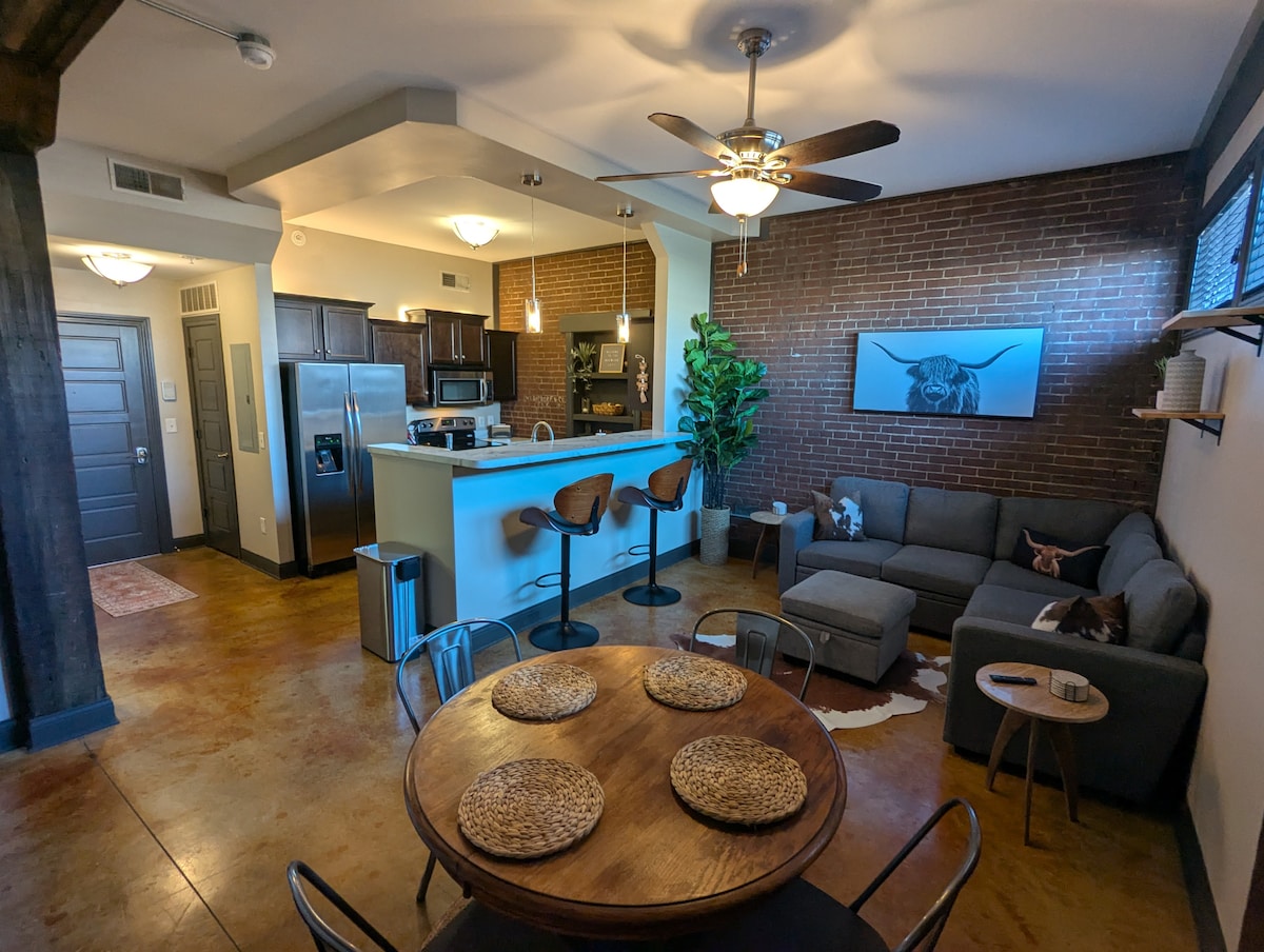 Välkommen till loftlyx, gångavstånd till BJC, nattliv, tunnelbanestation och Whole Foods! Detta utrymme inkluderar garageparkering, inbyggd W/D och allt för att bo en natt eller en månad! Andra bra funktioner: - Högt i tak och stora fönster - Utdragbar soffa - 55 tums TV - Arbetsyta med snabbt trådlöst internet - Fullt utrustat kök - Queen memory foam bed *Observera att detta lofts sovrumsväggar inte sträcker sig till taket och det finns ingen dörr. Kontrollera foton för att säkerställa att boendet uppfyller dina behov!