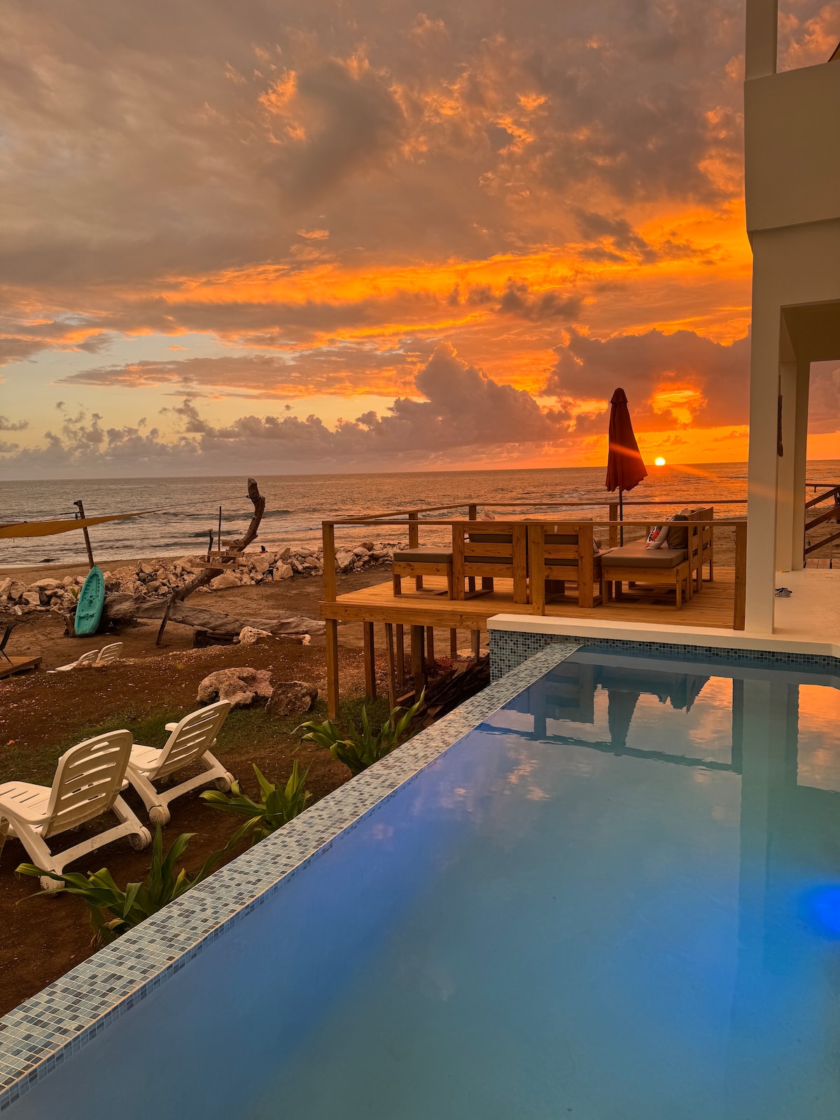Strandnära villa i Treasure Beach, på Jamaicas sydkust, där det är soligt året om! Bara några steg från en avskild sandvik, perfekt för bad, solbad och milda morgonpromenader. Lugnt och tyst, villan har tre sovrum med dubbelsäng och i en stuga för två tillgängliga till extra kostnad. Det finns en privat pool och strand soldäck, stort vardagsrum och kök. En personlig kock ingår i hyran för frukost och middag, du betalar bara kostnaden för maten.