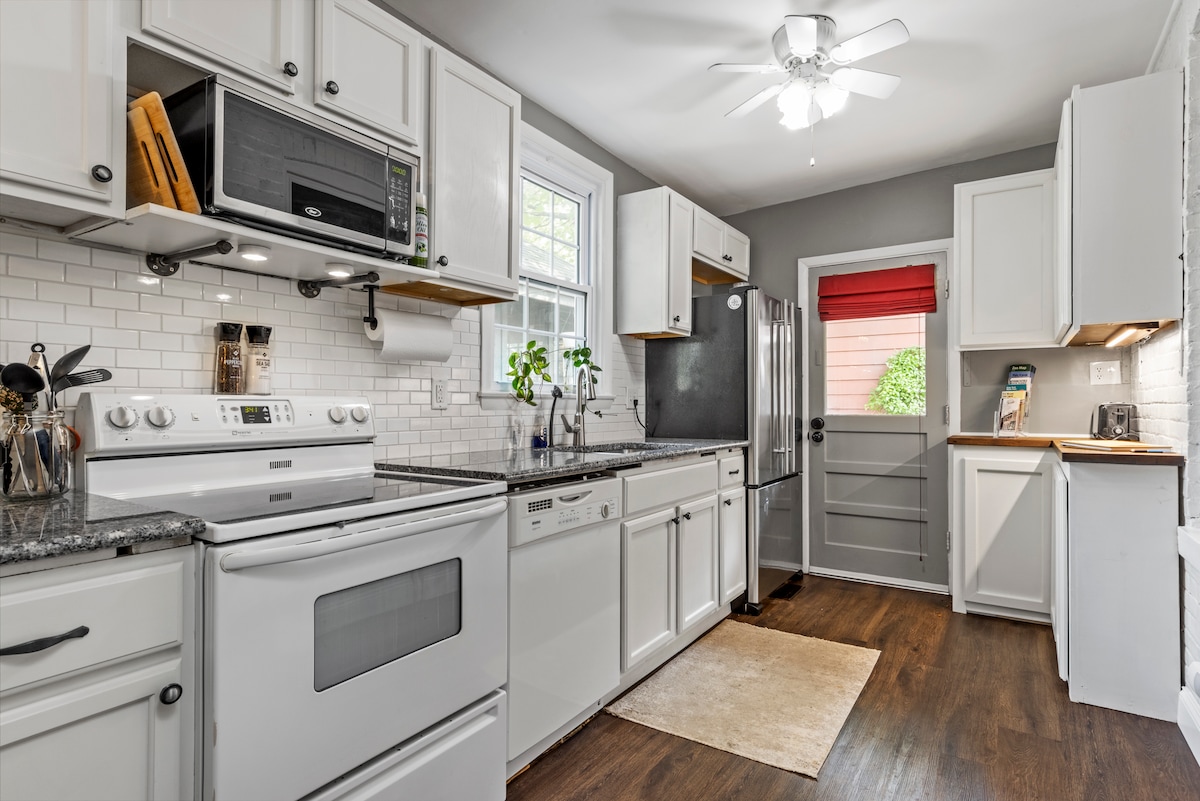 Ny dusch! Bedårande sekelskifteshem ligger i Midtown St. Charles Historic District och rymmer 7. Du får inte missa denna St. Charles Charmer! Uppdaterat, fullt utrustat kök, matrum med Keurig kaffebar, vardagsrum med 75" SmartTV och massor av sittplatser i hela, SmartTV i 2 sovrum, 2 fulla badrum, tvättmaskin och torktumlare, utomhus lusthus med bord och stolar. Gata och uppfart parkering. Nära områdets attraktioner: Historic Main Street, Ameristar Casino och Lindenwood University.